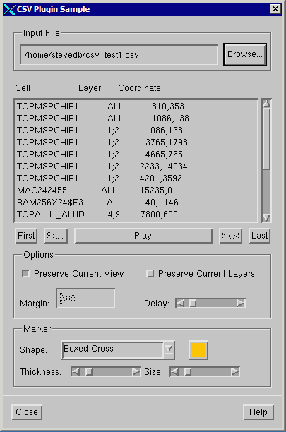 UsesWhile this plug was developed as a learning tool, one might use it as a way to review critical problems in a layout. One could easily extend it by having a string of text associated with each site that would be displayed or by snapping a bitmap of each window. User InterfaceThe CSV user interface is described below: Starting the CSV Plug-In (UNIX)Load a GDSII or OASIS file into Qckvu3. Then from the Tools drop down menu select: CSV Plug In Sample.
