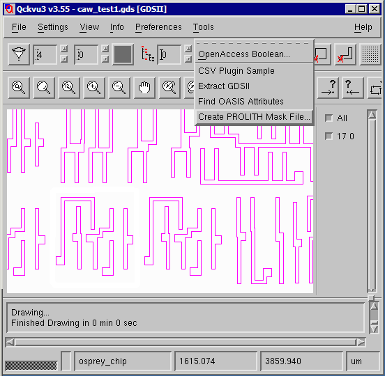 Any geometries crossing the selection window will be clipped to the edge of the extraction window. Once the mouse has been used to select the window, the Prolith dialog is updated. Note that units displayed in the Prolith dialog are in nanometers. ![]() Save As - Once you have determined that all settings are correct and that the desired polygons are inside your window, click on Save As. You will be able to set the name of the mask file that is produced. If you need multiple selections, just define a new window and hit the Save As button again. Be sure to use a different file name for each selection. |