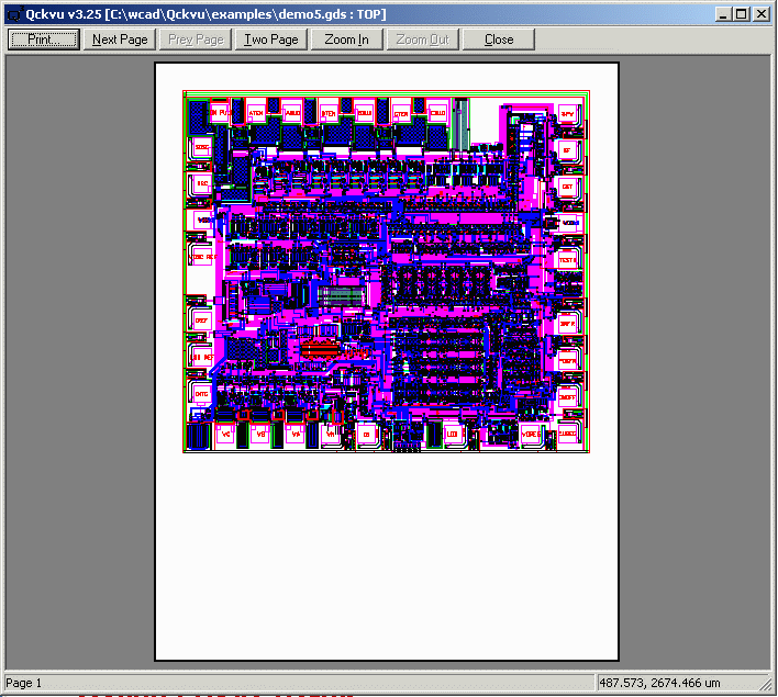 Qckvu3 Windows Printing and PlottingQckvu3 is Artwork's third generation layout viewer supporting GDSII and OASIS layout databases. Our printer driver enables the user to print in color and black and white to Windows supported printers. UsageFirst load the GDSII or OASIS file you wish to print. Turn on any layers you wish to print. Layers that are not visible will not print. You will probably want to turn off markers and turn the array setting to full. You may wish to turn off text. Adjust the display filters as needed. If the display filters are set too large (i.e. 20/20) then the plot may also show the blocked our display areas. In the example below, the display filters are set so high that the large green and magenta structure fill regions will not produce a pleasing plot. Adjust the outline color and fill colors as desired for the plot. Remember that your paper has a white background; therefore if you regularly use a black background change it to white and then re-evaluate your choices for color and fill. ![]() |