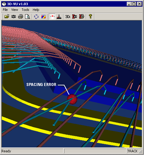 Wire DRC in 3D is used to check wire to wire spacing, wire to die body spacing and wire to pad/conductor spacing. 3DVU allows the user to define multiple spacing rules. Rules can be setup to apply to specific wire groups (tiers or loops)and can be further filtered by net and layer if so needed. The user defines a different colored marker for each type of error. Whenever the DRC detects an error it places that marker at the location where the error is deemed to be located. |