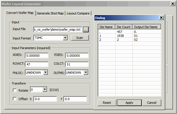 Introduction to the ProgramWMAPLayout is a plug-in that runs inside of Artwork's Qckvu3, GDSII Viewer. The viewer provides the display and measurement functions needed. Starting the Program Start up Qckvu3 and then using the Plugins pulldown select: WMAPConvert. ![]() You will see the following dialog that has 3 tabs. The first tab is for creating a layout from the wafer map ascii file. The second tab is for creating a layout from the shot map parameters. The final tab is to overlay the two layouts so that the user can measure the "offset" and then use that to create his template for the RDL mask set. ![]() Converting a Wafer Map into a Layout We'll start by converting a wafer map into a GDSII layout. First we select the wafer map file, wafer_map.txt, to load and scan. A small dialog will pop up that shows what die ID's were found and how many of each were found. ![]() If we want to create a valid SINF file output from this non-standard wafer map input, we need to change some of the die ID's to conform to the SINF specification. For example, in SINF the ID for null or nonexistent die is "__" For alignment die the ID is typically FF. So we'll make those changes and click Apply. ![]() Next we must enter the size of the die. This information is sometimes included in the wafer map file and sometimes it is not. We also enter the location of the wafer flat or notch. This is merely to get that parameter into the SINF file and does not affect the layout. You can choose the units to work in. Typically this will be mm or um. ![]() Select a base name for your layout file and a directory where to place it. Now, press the Convert button and a GDSII layout will be created and loaded into Qckvu3 for display. You should see something like this: ![]() Each die is represented as a rectangle and a text entity for easy identification. It is placed as a cell. This would be an excellent template for our RDL mask with one exception -- we've autocentered the array about 0,0 but in practice the array of die is not placed exactly in the center of the wafer. We need to offset it a small amount in order to precisely match the position of the existing devices on the wafer. Unfortunately we are never given the offset in terms of the array center. What we are given is a set of shot map parameters along with the offset of the center reticle from the wafer 0,0 point. So let's move to the second tab and generate a layout using the shot map parameters. |
