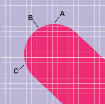 Consider the pixel locations labeled A, B and C. What gray scale value should be assigned to each of these pixels and how should it be calculated?